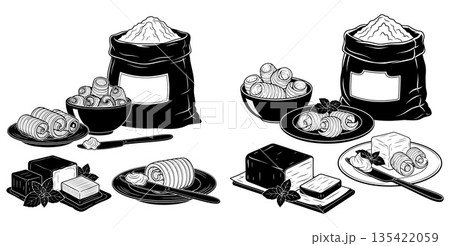 Stylized black and white illustration of butter, olives, and flour sack, line art