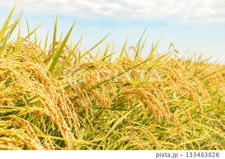 金黃的稻穗與白雲的天空形成鮮明對比。秋分前後,稻米開始變色的稻田景觀。