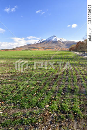 拍攝北海道森町初冬時節秋播麥田發芽的景像以及白雪皚皚的駒嶽山。