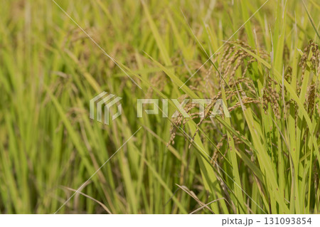 金黃稻穗的特寫。秋分前後稻米剛開始變色的稻田景象。