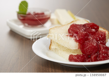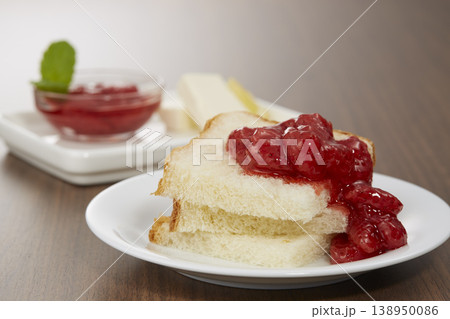一張清淡的早餐圖片,包括草莓醬和切片麵包。