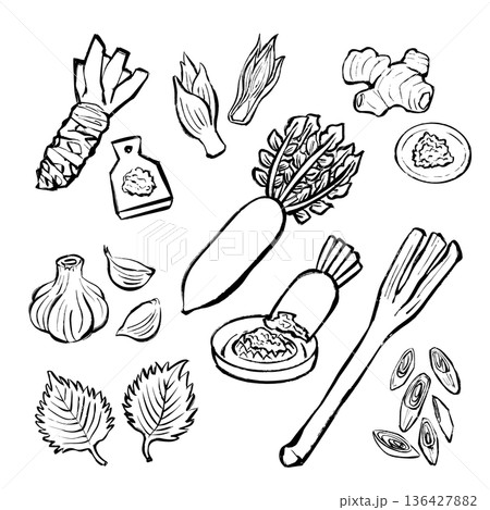 單色插圖,描繪了一套芥末及其調味品:根、葉、磨碎器、紫蘇和芝麻。