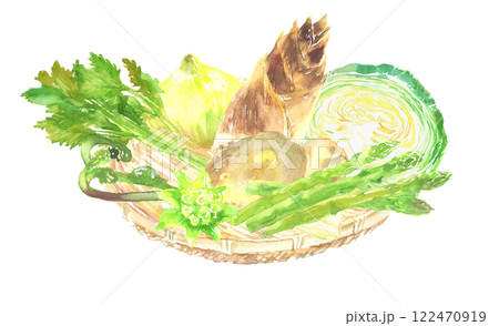 水彩畫一組春季蔬菜(竹筍、新洋蔥、春白菜、款冬芽、油菜花、蘆筍等)