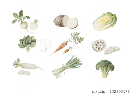 「蕪菁」、「高麗菜」、「白蘿蔔」、「蔥」、「蓮藕」、「芋頭」、「紅蘿蔔」、「牛蒡」的插圖