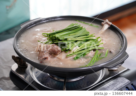 Healthy Korean Boiled Whole Chicken Soup Baeksuk with Fresh Chives in a Traditional Pot