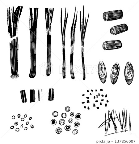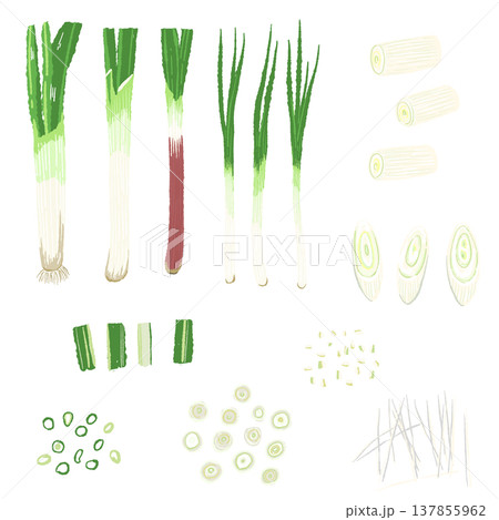 一組插圖,展示了整個和切碎的青蔥的各種形態。