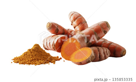 turmeric roots and turmeric roots on white background
