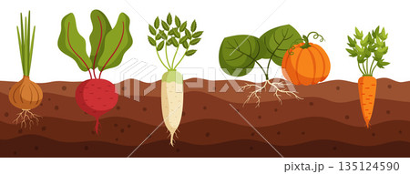 Vegetables Grow In Ground Cross Section View Of Onion, Beetroot, Daikon And Pumpkin With Carrot Veggies In Soil