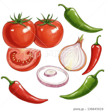 Fresh Red Tomatoes Green and Red Chili Peppers with Onion Slices