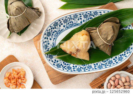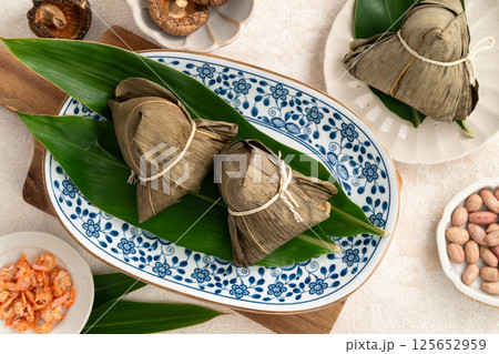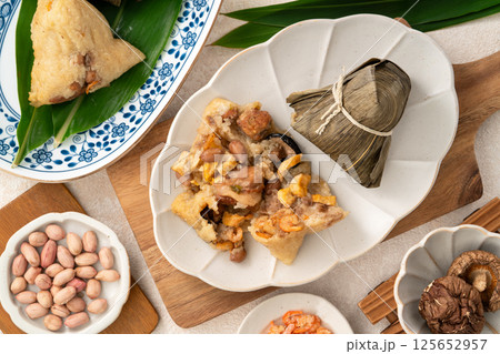 包裹好的粽子周圍擺放著各式各樣的粽子餡料