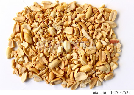從正上方俯視,可以看到白色背景上散落的碎花生。