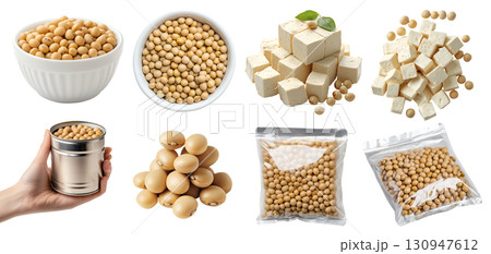 Soybean, soya soy bean, Glycine max legume seed plant pea vegetable, tofu beancurd bean curd, sealed packet foil, bowl, pile stack, hand hold can on transparent cutout PNG. Mockup template