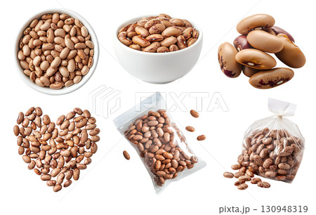Pinto frijoles speckled bean, Phaseolus vulgaris legume seed plant pea vegetable, bowl, sealed packet pack foil, heart love shape, pile stack on transparent cutout PNG. Mockup template