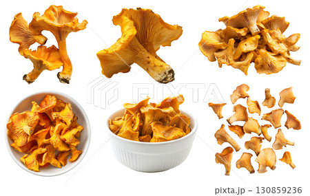 Chanterelle Cantharellus Craterellus Gomphus Polyozellus mushrooms fungus fungi vegetable, many angles view side slice top front bowl isolated on transparent cutout, PNG. Mockup template