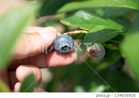 一名男子正在採摘成熟的藍莓(7月) 園藝生產