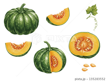 各種西瓜和甜瓜(完整和切開的果實)的插圖素材