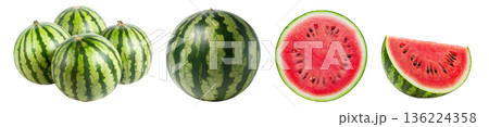Set isolated fresh tropical fruit, ripe watermelon in various style, whole, cut, sliced, on transparent background.