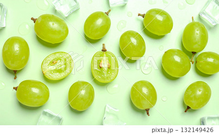 Flat lay of fresh green grapes, ice, and water drops on a pastel green background.