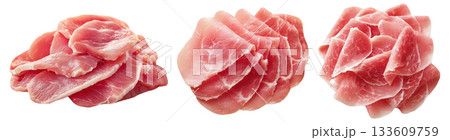 Set of fresh raw meat cuts, thin sliced pork belly, isolated on transparent background. Fresh meat for cooking, food preparation, and advertisement.