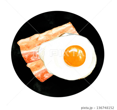 盤子裡盛著培根和雞蛋(煎蛋)。手繪水彩畫,描繪蛋料理。