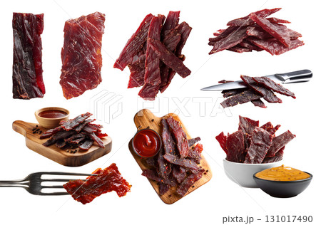 Set of meat jerky, beef pork chicken turkey, sealed plastic pack, flying, fork, serve board, bbq sauce, box, bundle sliced pile stack on transparent cutout PNG. Mockup template