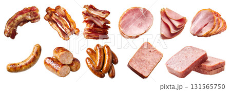 Collection of 4 set processed meat, frankfurter wiener bratwurst sausage, bacon salt-cured pork, Parma ham Prosciutto, Spam luncheon meat, fork diced cube slice whole, transparent cutout PNG. Mockup