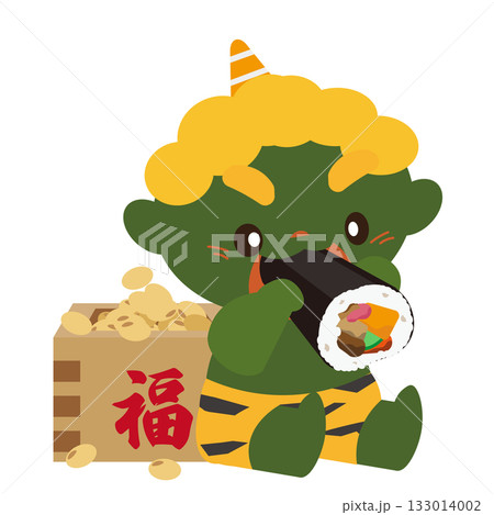 圖:一個綠色惡魔背上背著一盒豆子,正在吃江戶捲。