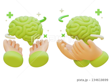 3D Claymorphism Hand Holding Floating Green Brain with Medical Plus Icons and Sparkles