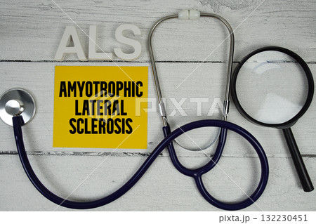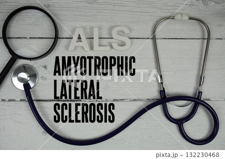 ALS Amyotrophic Lateral Sclerosis text with Stethoscope on wooden background