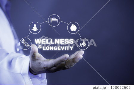 Wellness and Longevity Concept with Healthy Lifestyle Icons, Sleep, Nutrition, Exercise and Mindfulness Care