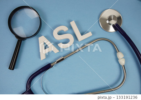 ALS Amyotrophic Lateral Sclerosis text with Stethoscope and magnifying glass on blue background