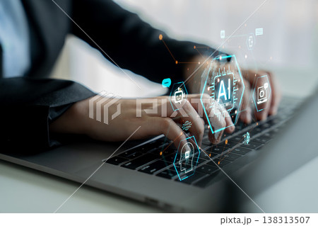 Close up of woman using laptop with AI generative technology interface. Content creator typing command prompts to generate digital art and text using artificial intelligence in modern office.