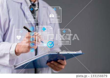 Doctor analyzing digital health patient data medical record EHR information, clinical data, checklists and organ diagnostics reports
