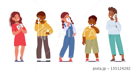 Cute Little Children Boys And Girls Character Show Five Senses Flash Cards Hearing, Sight, Smell, Taste And Touch