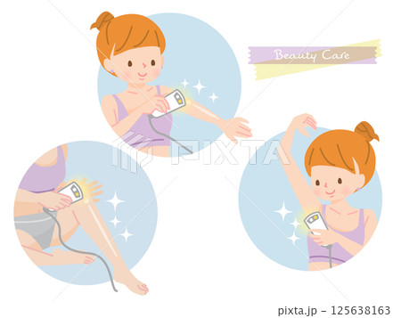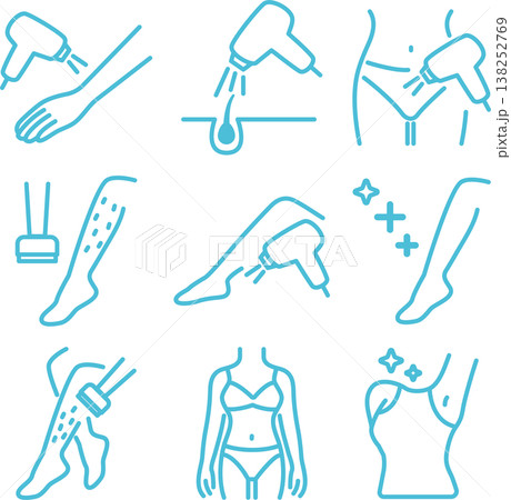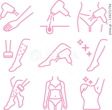 美容除毛圖示集。包含身體各部位(例如腿部、手臂、腋下和臀部)的雷射除毛療程插圖。