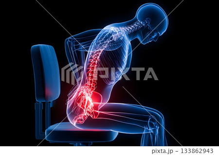 Anatomical figure showing back pain while sitting in a chair