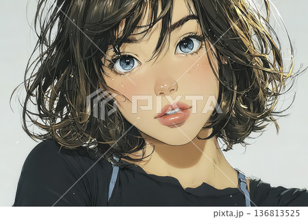 一幅健康年輕女性的肖像插畫,她留著齊耳短髮,擁有一雙美麗的眼睛。