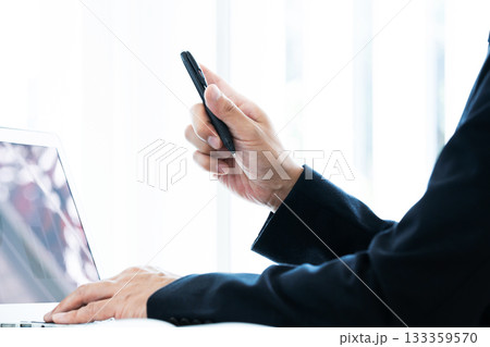 一位身穿西裝的中年男性商人坐在辦公桌前,一邊使用電腦,一邊看圖表