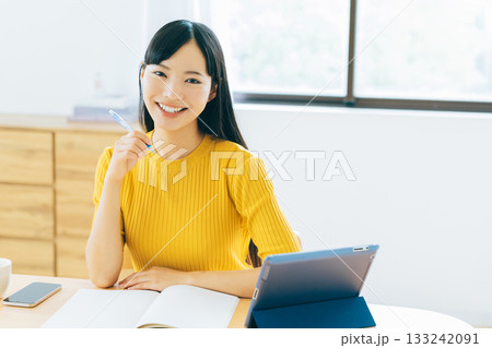 一位年輕女子手持 Apple Pencil 參加遠距課程。