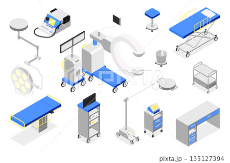 Operating room 3d isometric mega set in isometry graphic design. Collection elements of couch, lamp, monitoring system, tables, stretcher, x-ray, surgery equipment, other tools. Vector illustration.