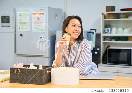 Pretty asian woman holding coffee mug as looking at orange standing aside toaster on kitchen counter