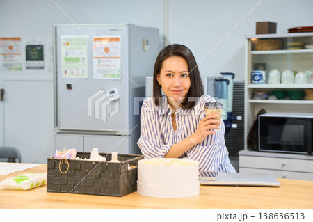 Smiling asian woman holding a coffee mug while standing aside toaster and fruits on kitchen counter.