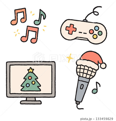 Christmas music note, game controller, television with Christmas tree, and festive microphone