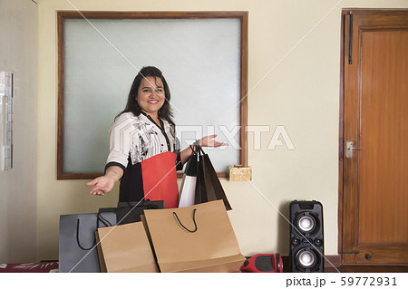 Portrait of a young woman standing around lots of shopping bags.