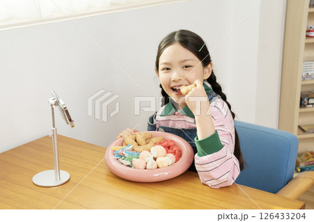 A cute child YouTuber who stands up on his smartphone and films a mukbang