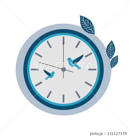 Wall decorative clock in flat design. Round clock with birds and leaves. Vector illustration isolated.