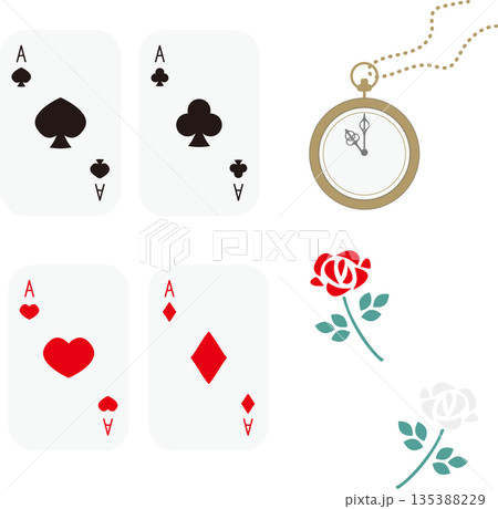 一套可愛的插畫,圖案包括玫瑰、懷錶和撲克牌。
