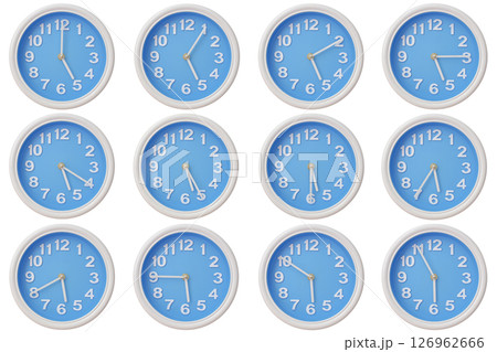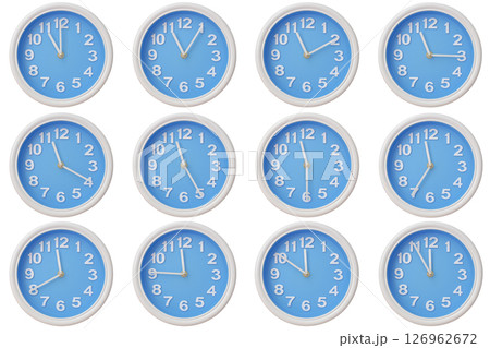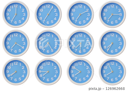 Collection of 12 round wall clocks displaying 01:00 to 01:55 or 13:00 to 13:55 on a clean white background, useful for concepts such as time zones, time management.