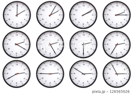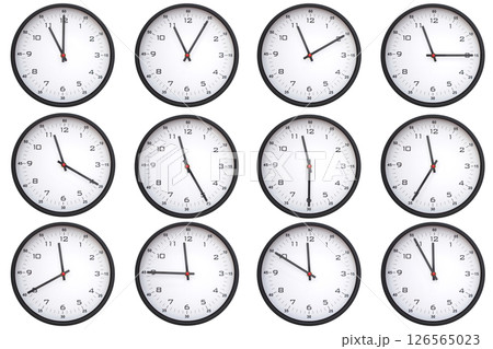 Set of photography of Isolated Minimalist Round Wall Clocks with Black Frames Showing Different Times from 12:00 to 11:00 for Deadline and Time Management Concepts