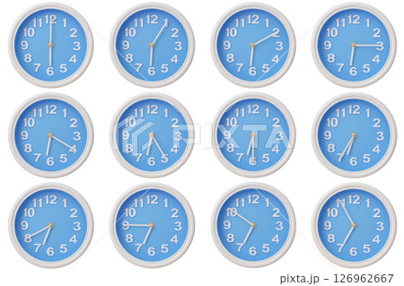 A set of 12 wall clocks, each showing a different time at 5-minute intervals from 05:00 to 05:55 or 17:00 to 17:55. Clean white background, ideal for time-related concepts or educational use.